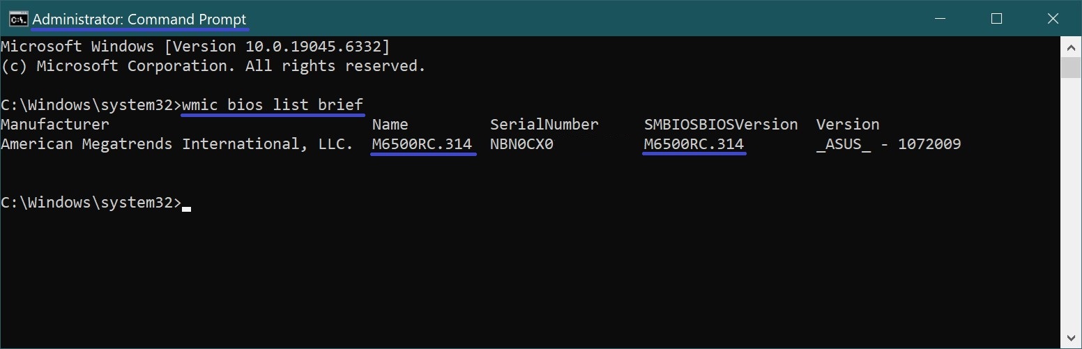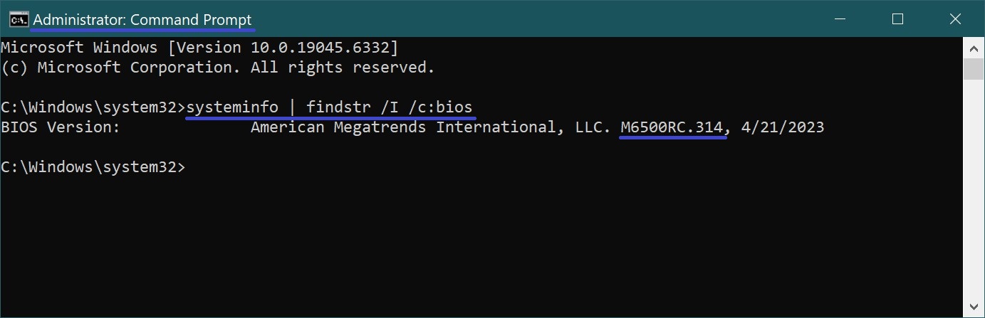 To find out the BIOS version of your motherboard, run Command Prompt as an administrator and enter the following command:
