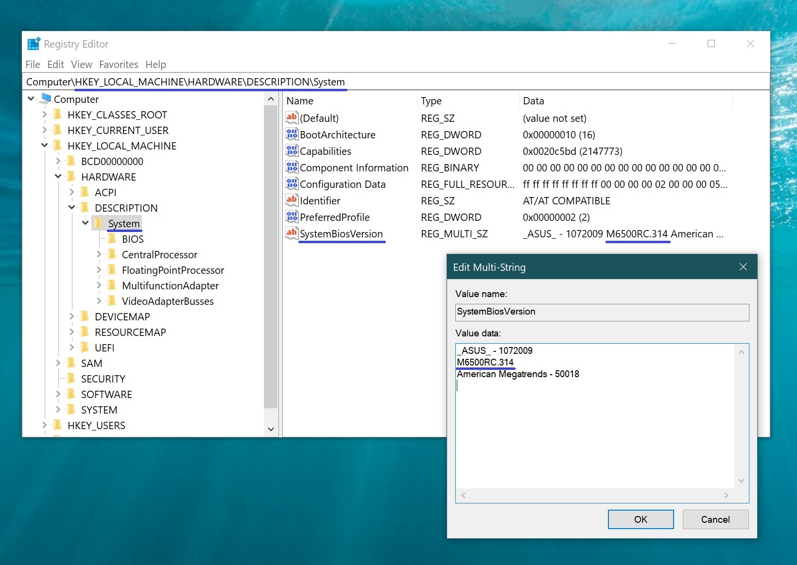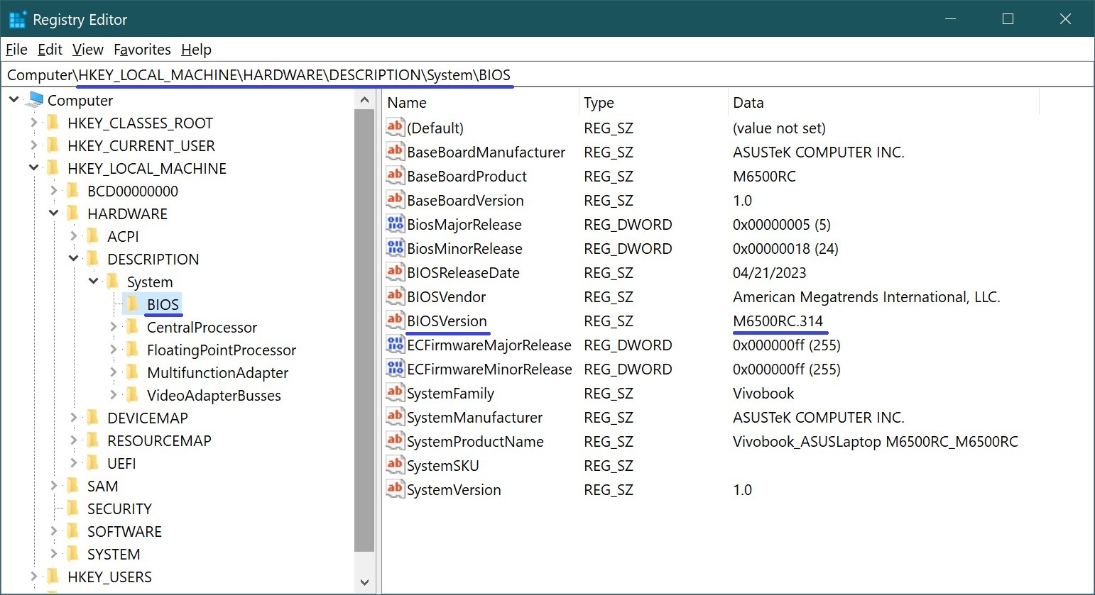 There, you’ll find the SystemBiosVersion multi-string value, which also shows the BIOS version installed.