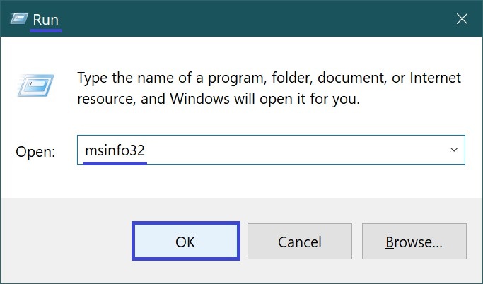 Press Win + R to open the Run dialog. Type msinfo32 and press Enter ↵.